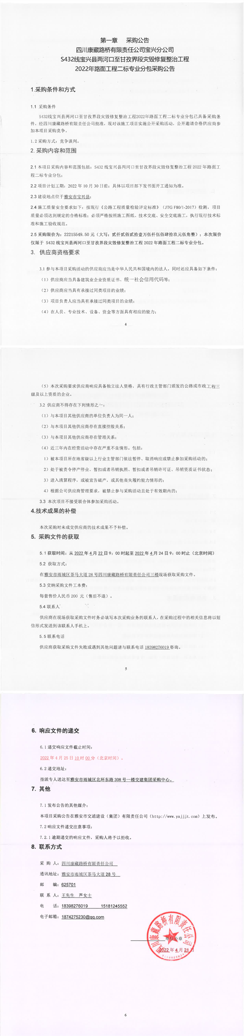 四川康藏路橋有限責(zé)任公司S432線寶興縣兩河口至甘孜界段災(zāi)毀修復(fù)整治工程2022年路面工程二標專業(yè)分包采購公告