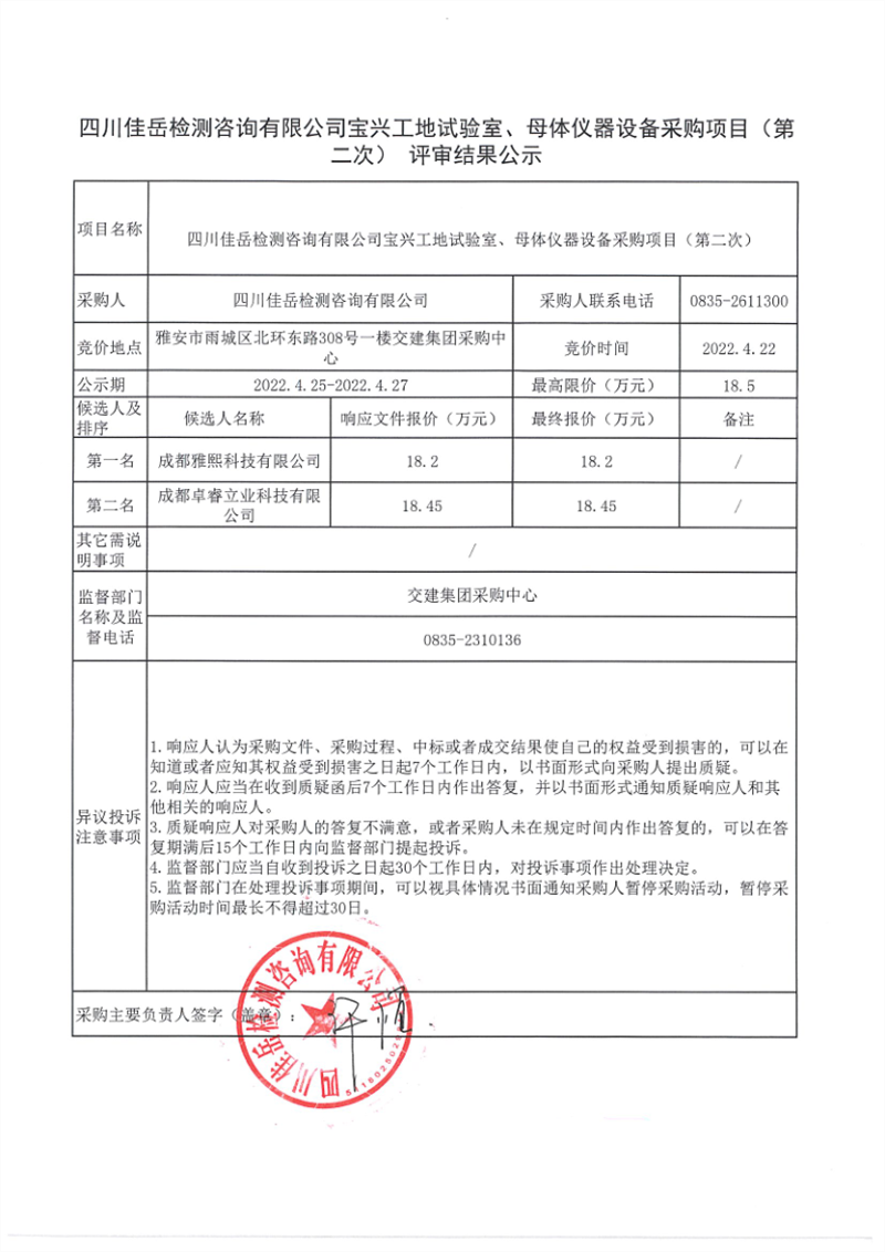 四川佳岳檢測咨詢有限公司寶興工地試驗室、母體儀器設備采購項目(第二次)評審結(jié)果公示