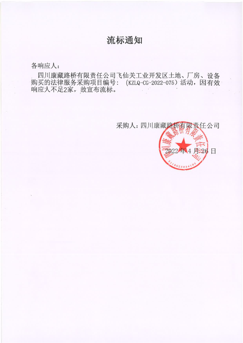 四川康藏路橋有限責(zé)任公司飛仙關(guān)工業(yè)開發(fā)區(qū)土地、廠房、設(shè)備購買的法律服務(wù)采購項目流標(biāo)通知