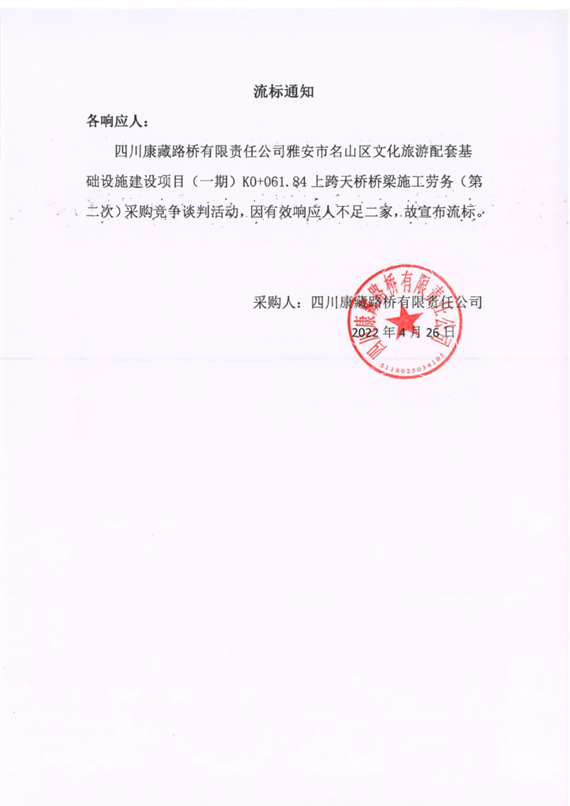 四川康藏路橋有限責(zé)任公司雅安市名山區(qū)文化旅游配套基礎(chǔ)設(shè)施建設(shè)項目(一期)K0+061.84上跨天橋橋梁施工勞務(wù)(第二次)流標(biāo)通知