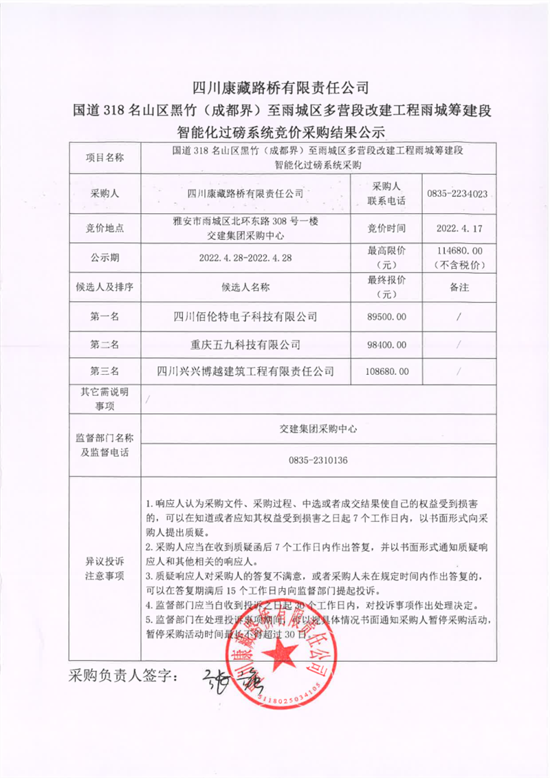 四川康藏路橋有限責(zé)任公司國道318名山區(qū)黑竹(成都界)至雨城區(qū)多營段改建工程雨城籌建段智能化過磅系統(tǒng)競價(jià)采購結(jié)果公示