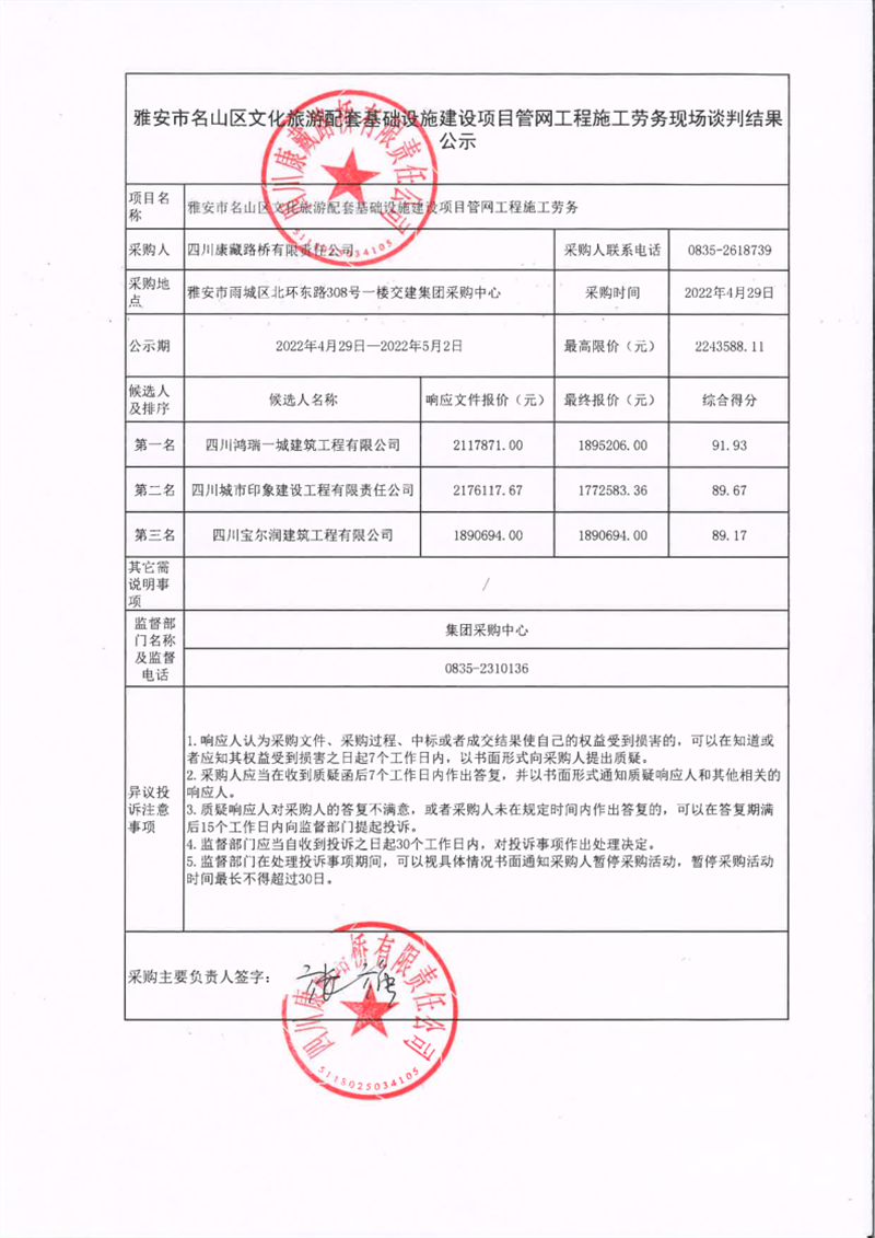 四川康藏路橋有限責任公司雅安市名山區(qū)文化旅游配套基礎(chǔ)設(shè)施建設(shè)項目管網(wǎng)工程施工勞務(wù)現(xiàn)場談判結(jié)果公示