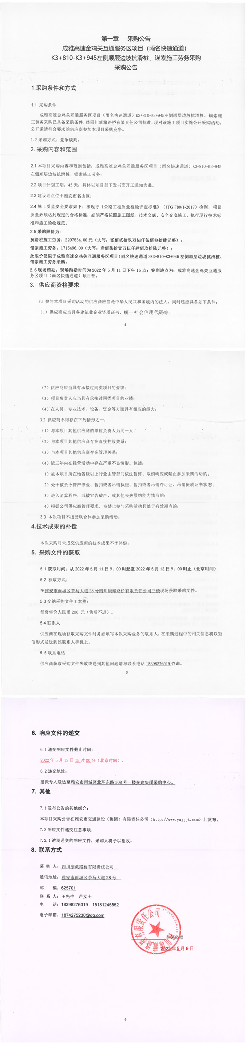 四川康藏路橋有限責(zé)任公司成雅高速金雞關(guān)互通服務(wù)區(qū)項(xiàng)目(雨名快速通道)K3+810-K3+945左側(cè)順層邊坡抗滑樁、錨索施工勞務(wù)采購(gòu)采購(gòu)公告