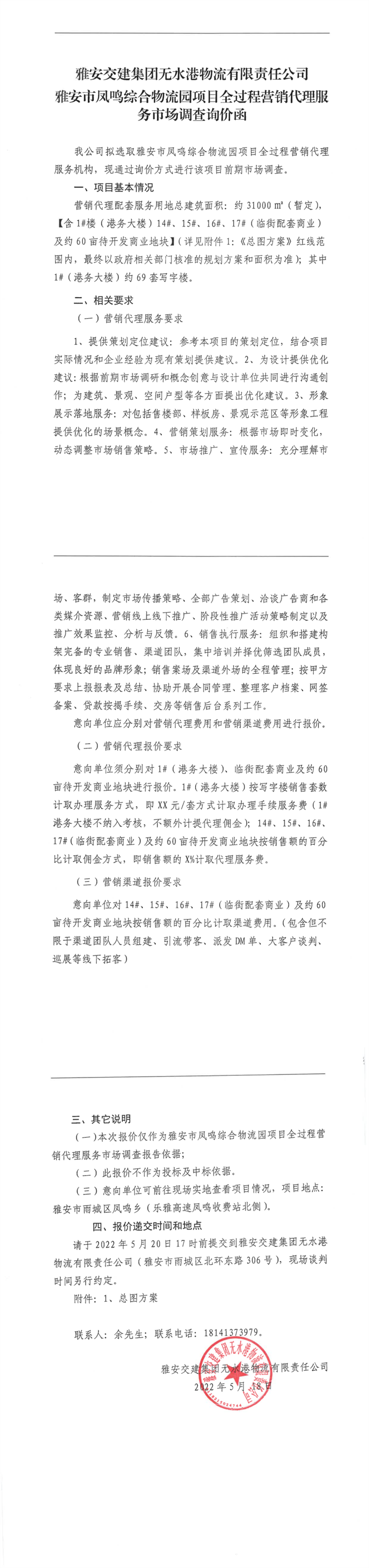 雅安交建集團無水港物流有限責任公司雅安市鳳鳴綜合物流園項目全過程營銷代理服務市場調(diào)查詢價函