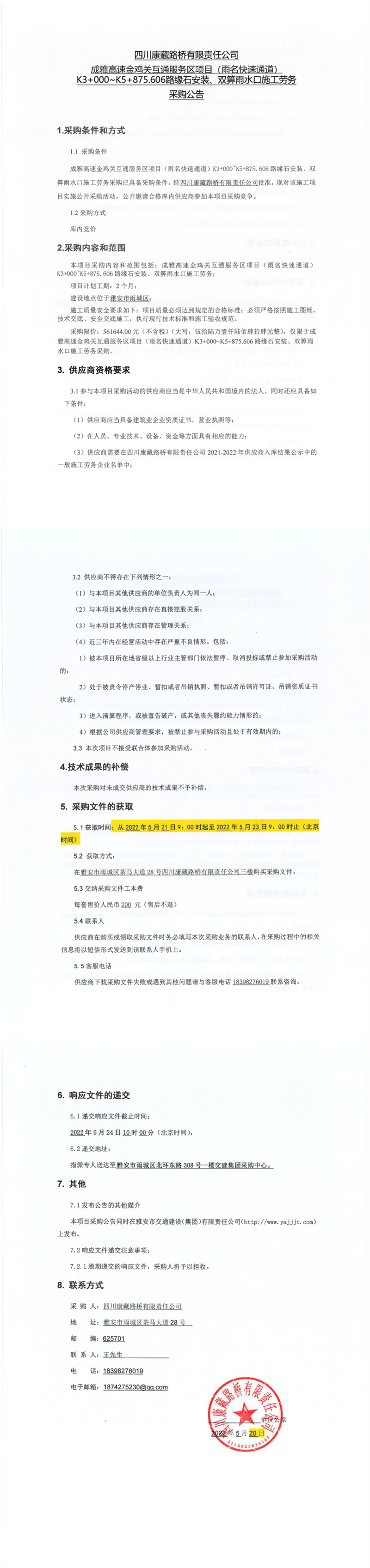 四川康藏路橋有限責(zé)任公司成雅高速金雞關(guān)互通服務(wù)區(qū)項目(雨名快速通道)K3+000-K5+875.606路緣石安裝、雙箅雨水口施工勞務(wù)采購公告