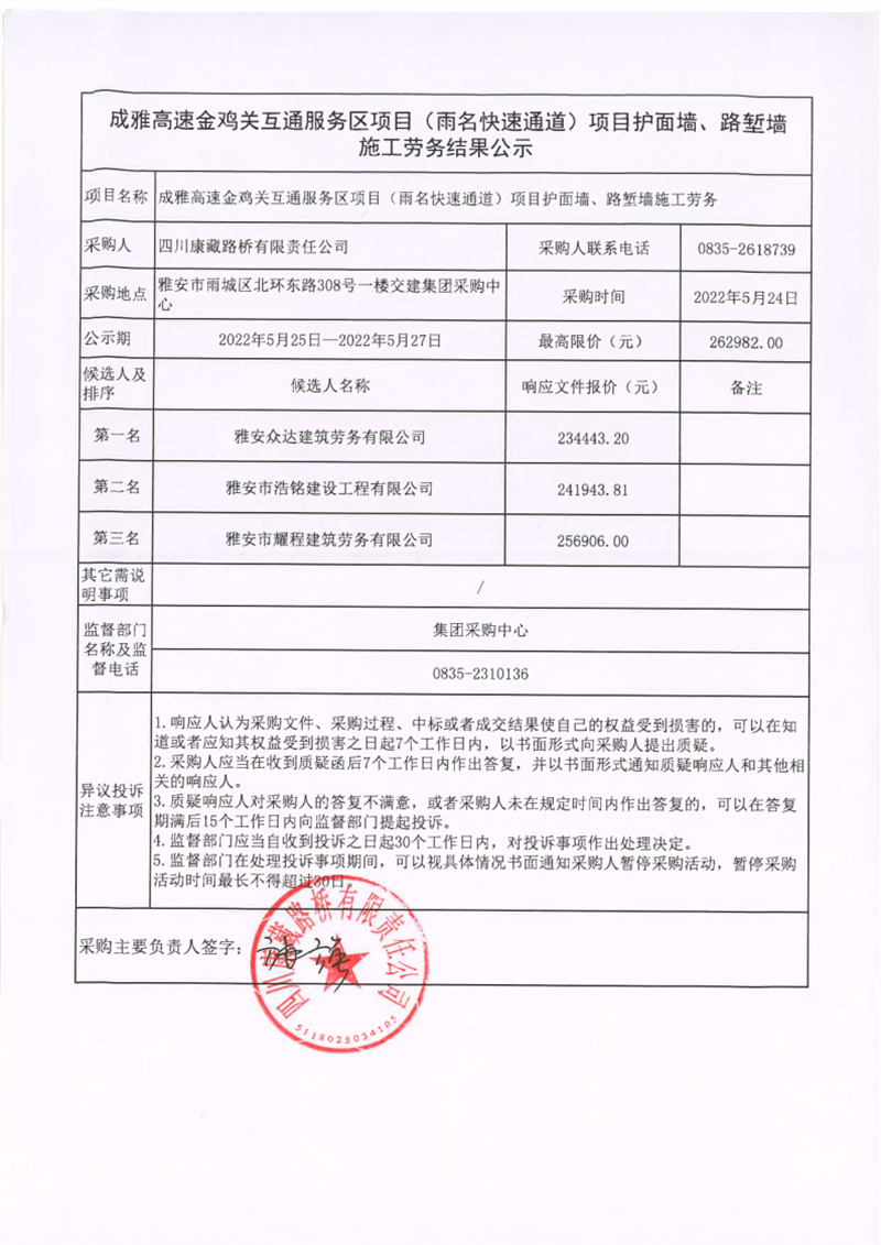 四川康藏路橋有限責任公司成雅高速金雞關互通及服務區(qū)項目(雨名快速通道)項目護面墻、路塹墻施工勞務結果公示