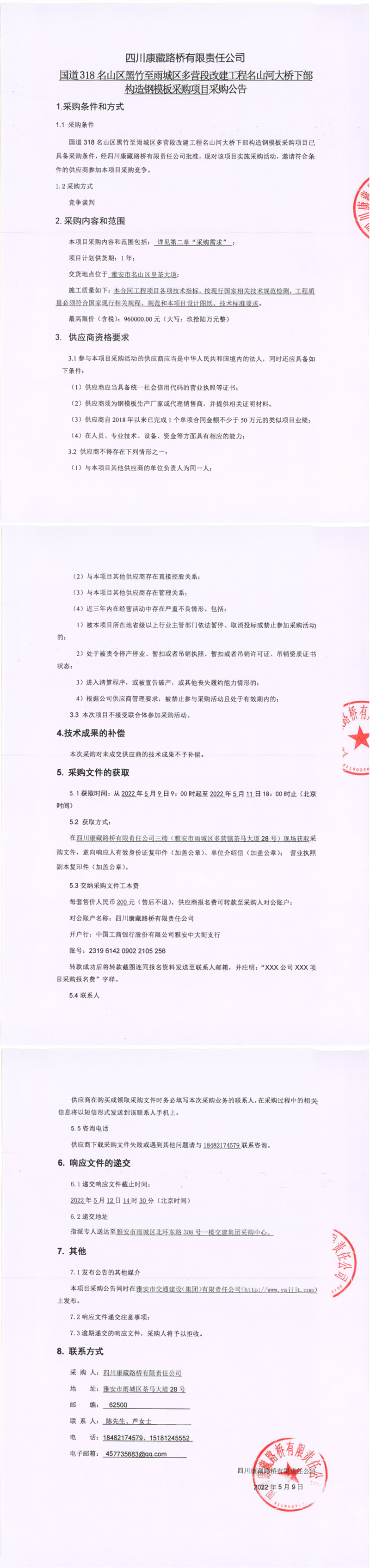 四川康藏路橋有限責(zé)任公司國道318名山區(qū)黑竹至雨城區(qū)多營段改建工程名山河大橋下部構(gòu)造鋼模塊采購項(xiàng)目采購公告