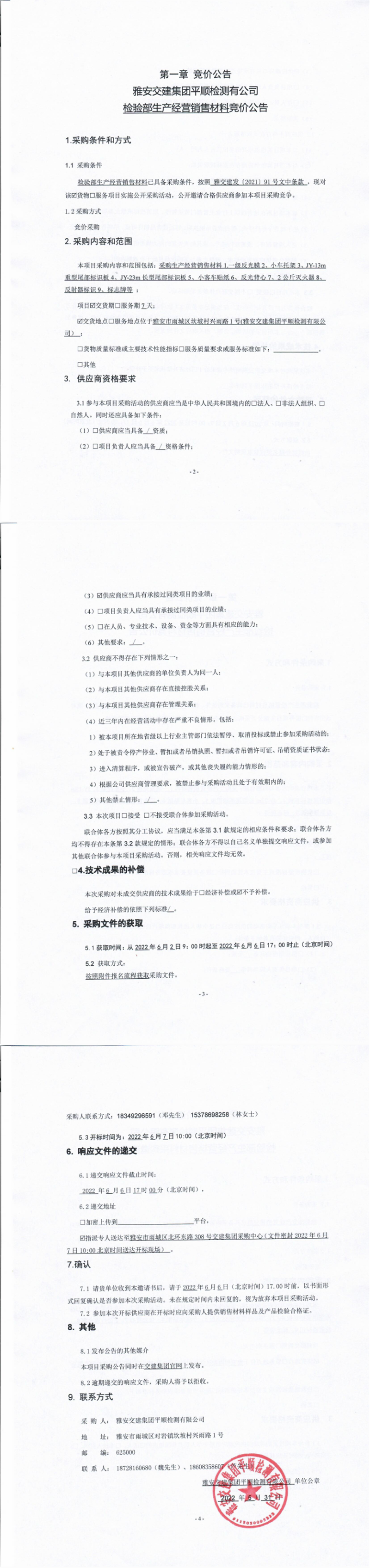 雅安交建集團(tuán)平順檢測有限公司檢驗部生產(chǎn)經(jīng)營銷售材料競價公告