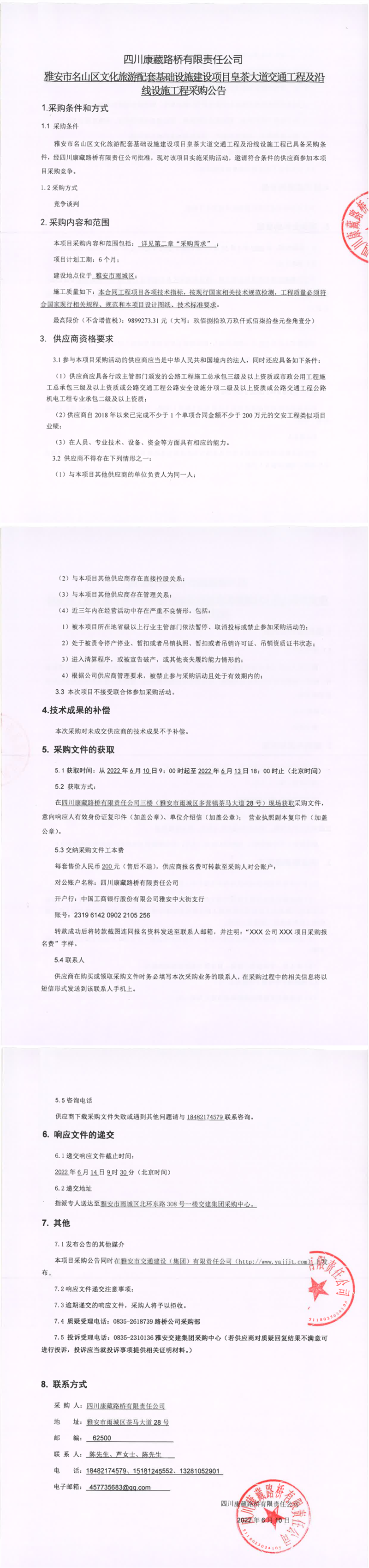 四川康藏路橋有限責(zé)任公司雅安市名山區(qū)文化旅游配套基礎(chǔ)設(shè)施建設(shè)項(xiàng)目皇茶大道交通工程及沿線設(shè)施工程采購公告