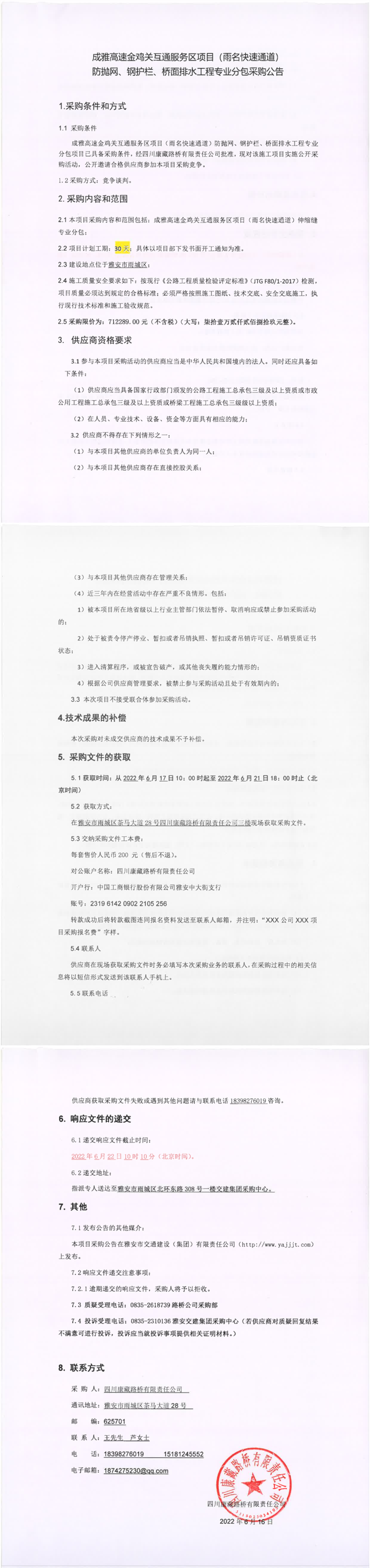 四川康藏路橋有限責任公司成雅高速金雞關(guān)互通服務(wù)區(qū)項目(雨名快速通道)防拋網(wǎng)、鋼護欄、橋面排水工程專業(yè)分包采購公告