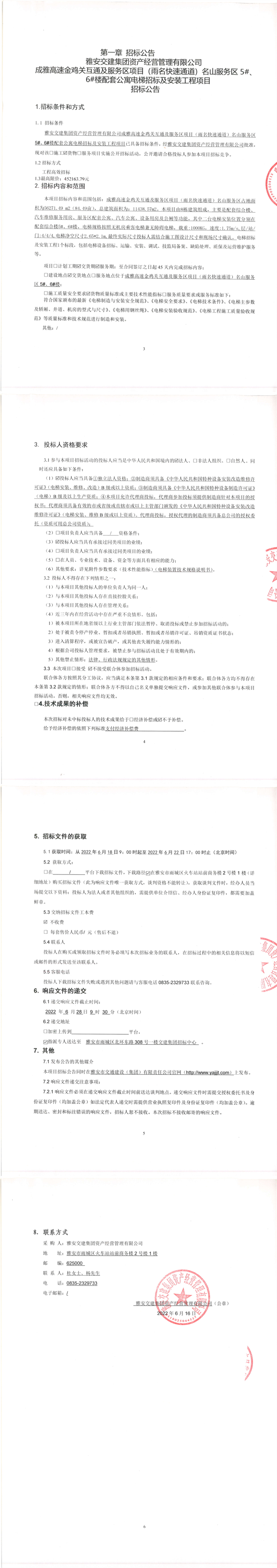 雅安交建集團資產(chǎn)經(jīng)營管理有限公司成雅高速金雞關(guān)互通及服務(wù)區(qū)項目(雨名快速通道)名山服務(wù)區(qū)5#、6#樓配套公寓電梯招標(biāo)及安裝工程項目