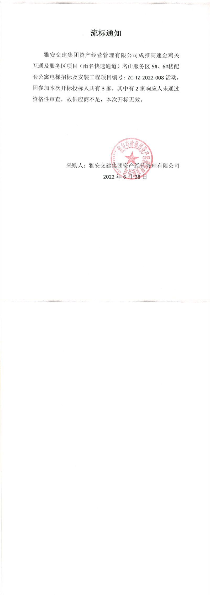 雅安交建集團資產經營管理有限公司成雅高速金雞關互通及服務區(qū)(雨名快速通道)名山服務區(qū)5#、6#樓配套公寓電梯招標及安裝工程項目流標通知
