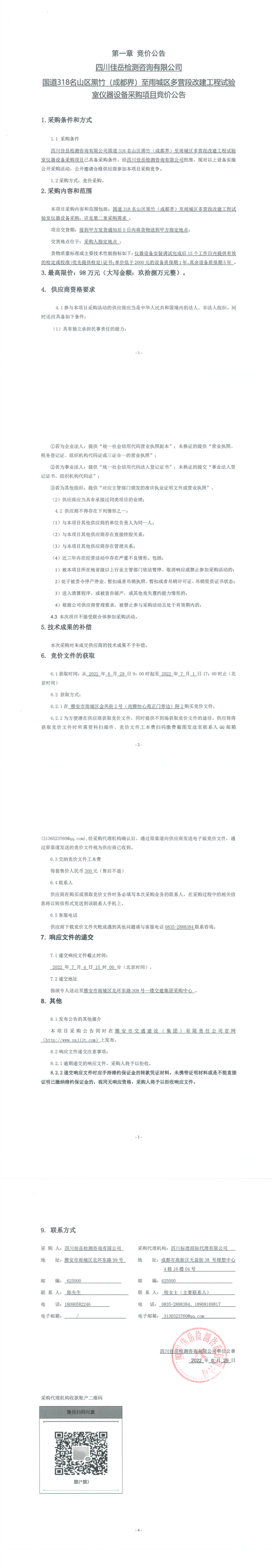 四川佳岳檢測咨詢有限公司國道318名山區(qū)黑竹(成都界)至雨城區(qū)多營段改建工程試驗室儀器設備采購項目競價公告