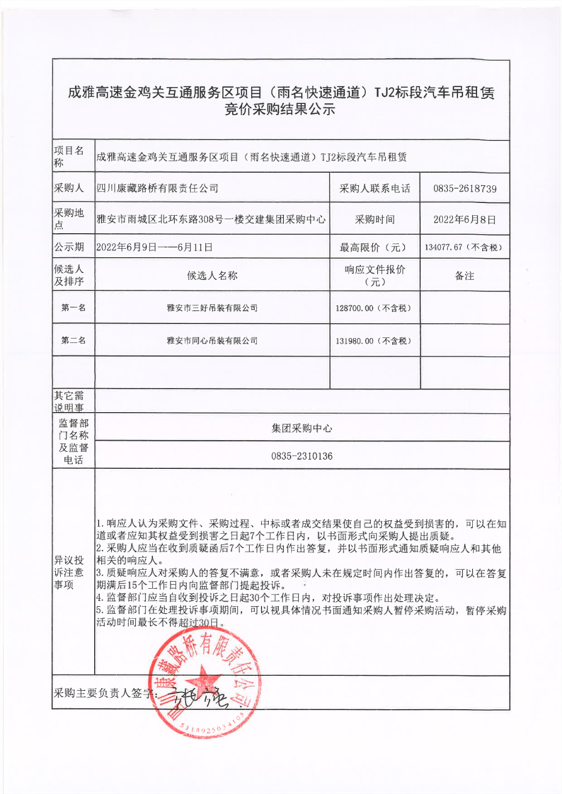 四川康藏路橋有限責(zé)任公司成雅高速金雞關(guān)互通服務(wù)區(qū)項目(雨名快速通道)TJ2標(biāo)段汽車吊租賃競價采購結(jié)果公示