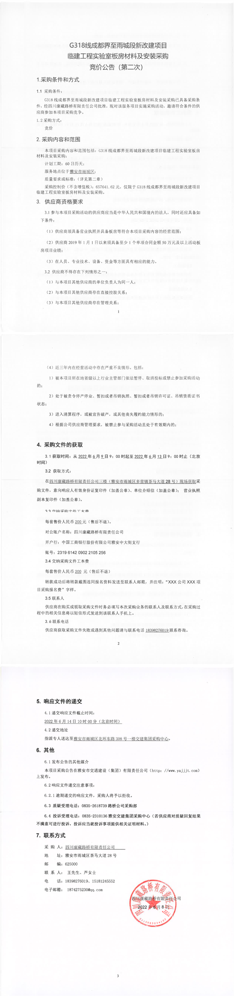 四川康藏路橋有限責(zé)任公司G318線成都界至雨城段新改建項目臨建工程實驗室板房材料及安裝采購競價公告(第二次)