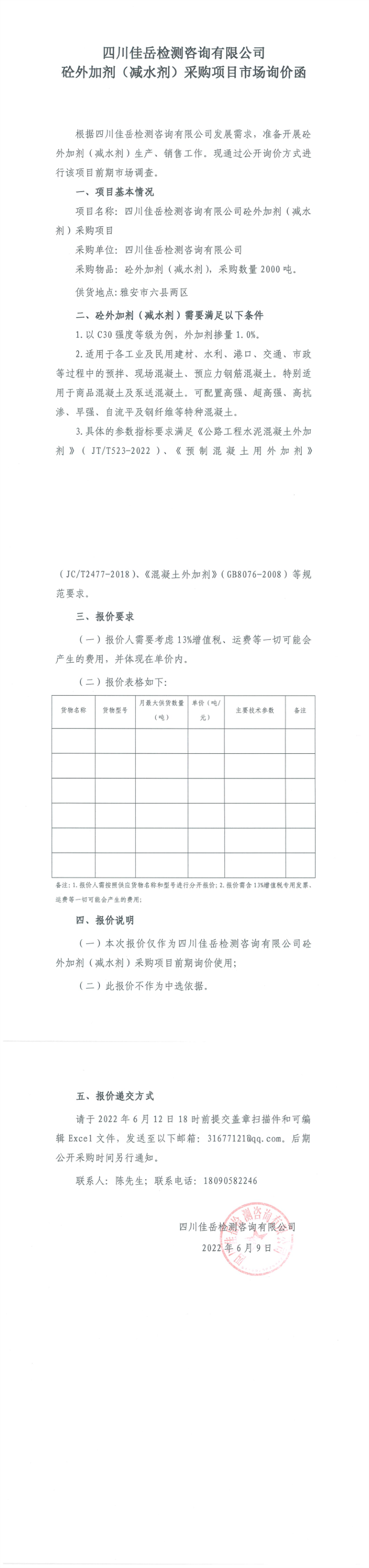 四川佳岳檢測(cè)咨詢有限公司砼外加劑(減水劑)采購(gòu)項(xiàng)目市場(chǎng)詢價(jià)函