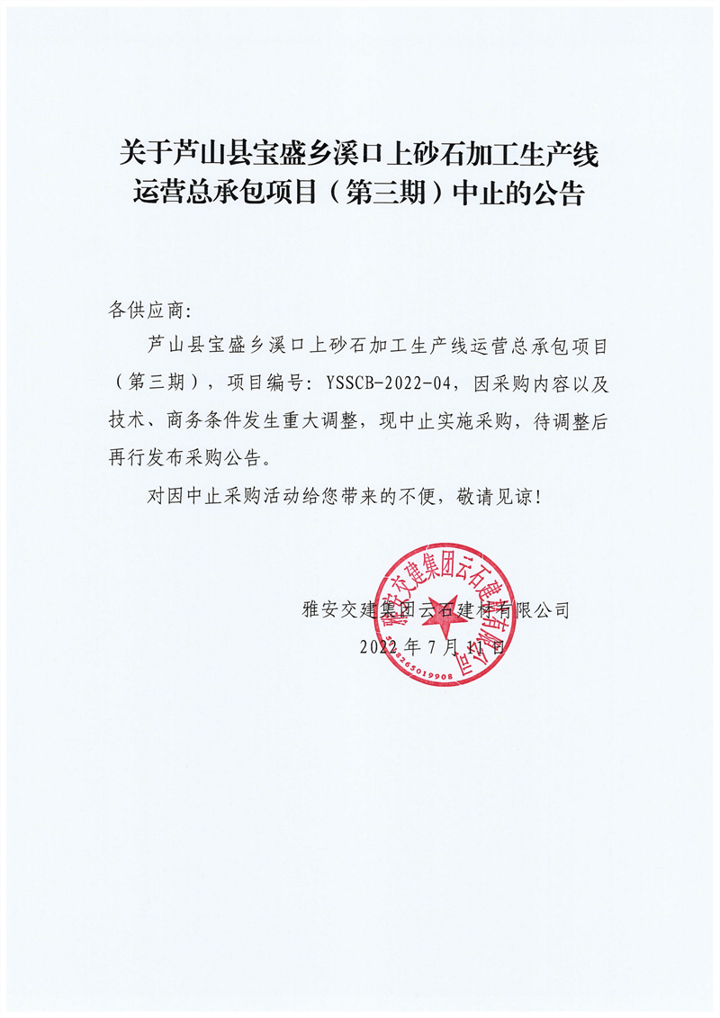 雅安交建集團(tuán)云石建材有限公司關(guān)于蘆山縣寶盛鄉(xiāng)溪口上砂石加工生產(chǎn)線(xiàn)運(yùn)營(yíng)總承包項(xiàng)目(第三期)中止的公告