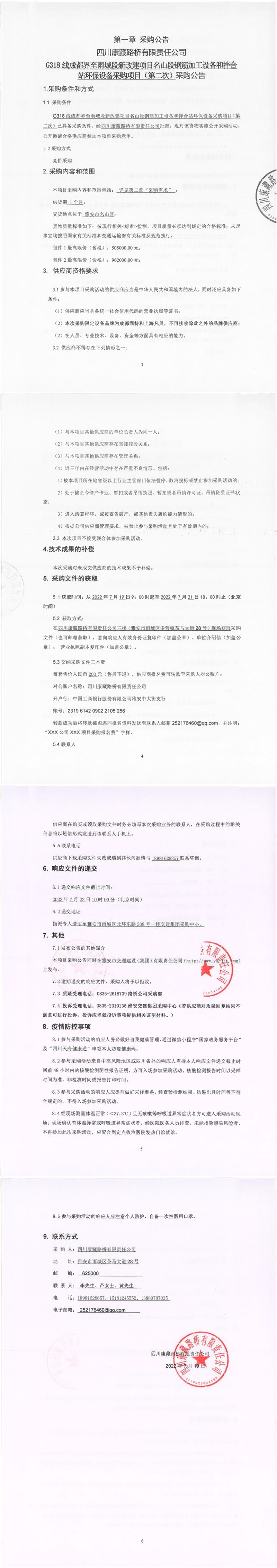 四川康藏路橋有限責(zé)任公司G318線成都界至雨城段新改建項目名山段鋼筋加工設(shè)備和拌合站環(huán)保設(shè)備采購項目(第二次)采購公告