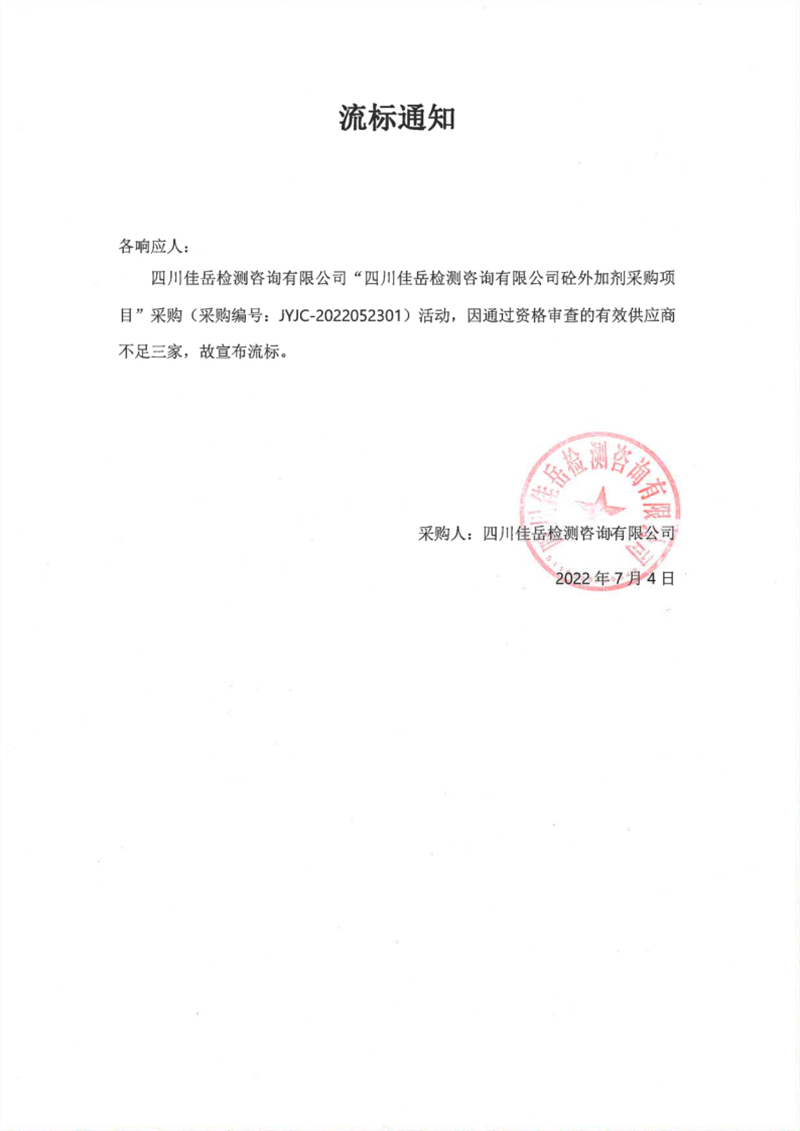 四川佳岳檢測(cè)咨詢(xún)有限公司砼外加劑采購(gòu)項(xiàng)目流標(biāo)通知