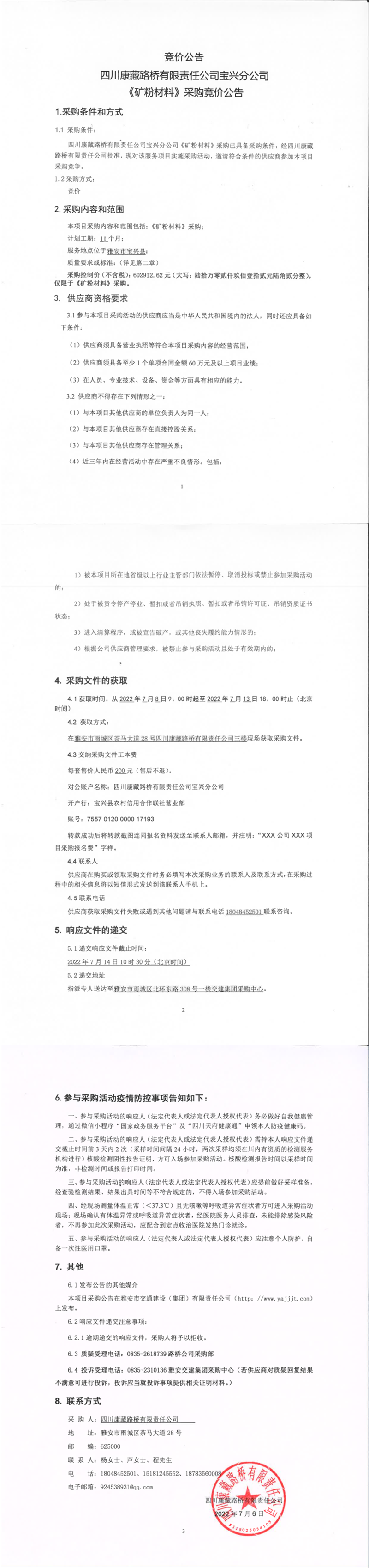 四川康藏路橋有限責任公司寶興分公司礦粉材料采購競價公告