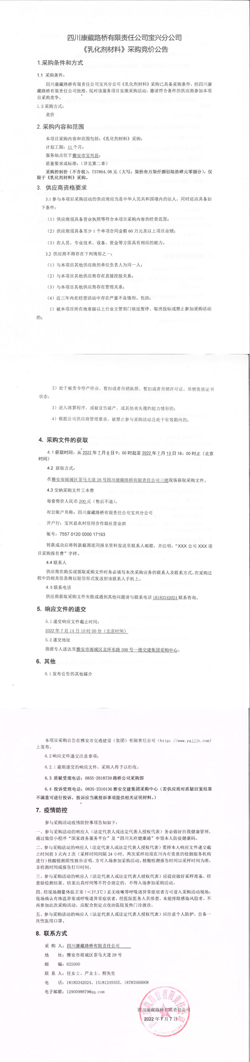 四川康藏路橋有限責(zé)任公司寶興分公司乳化劑材料采購競價(jià)公告