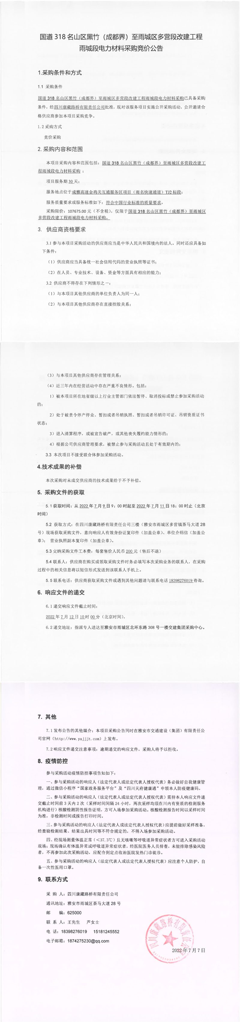 四川康藏路橋有限責任公司國道318名山區(qū)黑竹(成都界)至雨城區(qū)多營段改建工程雨城段電力材料采購競價公告