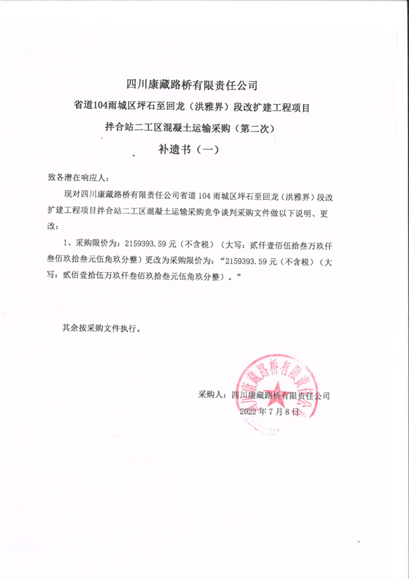 四川康藏路橋有限責(zé)任公司省道104線雨城區(qū)坪石至回龍(洪雅界)段改建工程項目拌合站二工區(qū)混凝土運輸采購(第二次)補(bǔ)遺書(一)