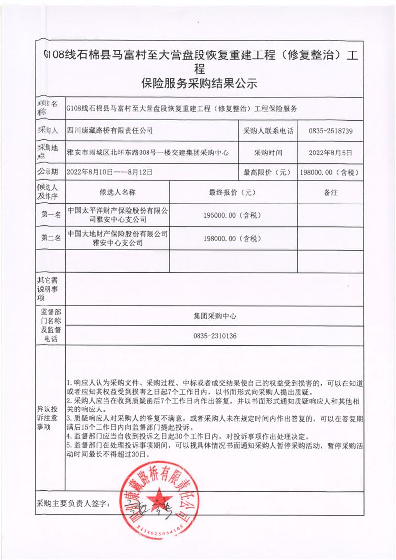 四川康藏路橋有限責任公司G108線石棉縣馬富村至大營盤段恢復重建工程(修復整治)工程保險服務采購結(jié)果公示