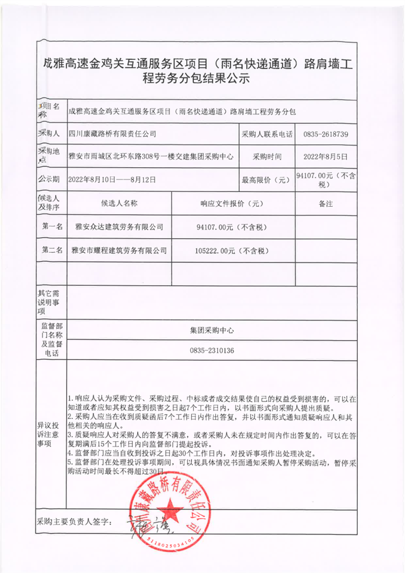 四川康藏路橋有限責任公司成雅高速金雞關互通服務區(qū)項目(雨名快速通道)路肩墻工程勞務分包結(jié)果公示