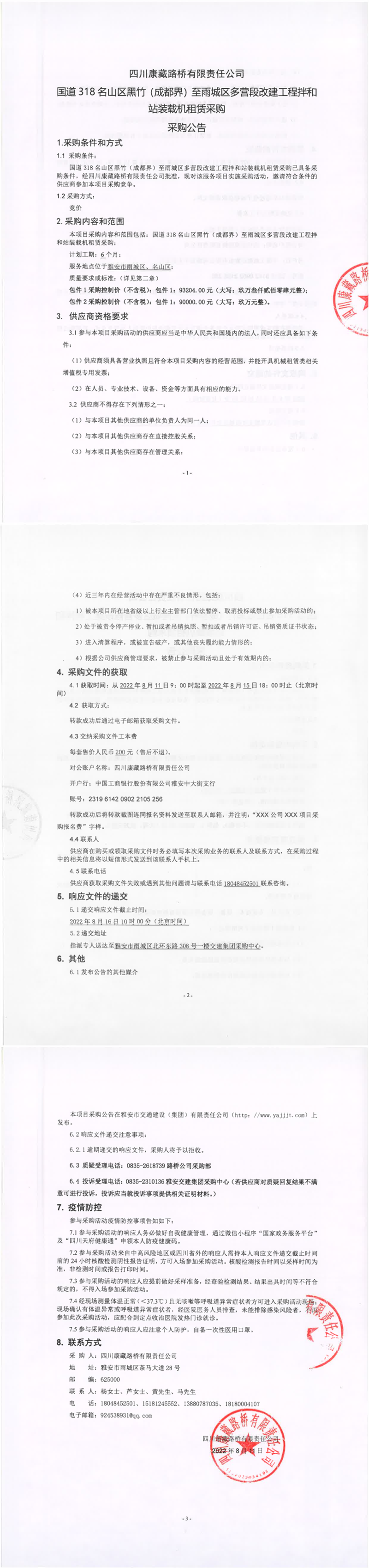 四川康藏路橋有限責(zé)任公司國(guó)道318名山區(qū)黑竹(成都界)至雨城區(qū)多營(yíng)段改建工程拌和站裝載機(jī)租賃采購公告