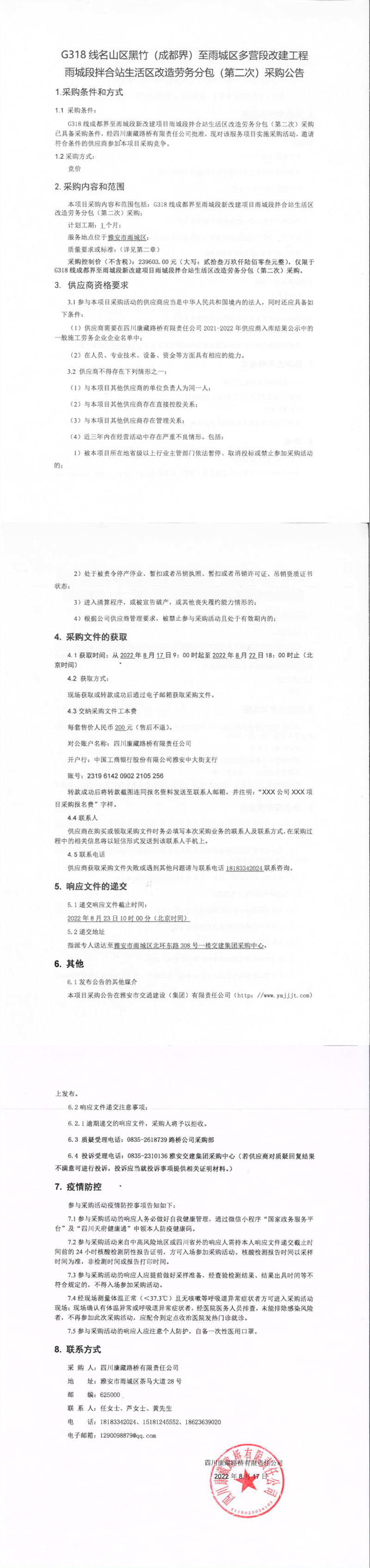 四川康藏路橋有限責任公司G318線名山區(qū)黑竹(成都界)至雨城區(qū)多營段改建工程雨城段拌合站生活區(qū)改造勞務(wù)分包(第二次)采購公告