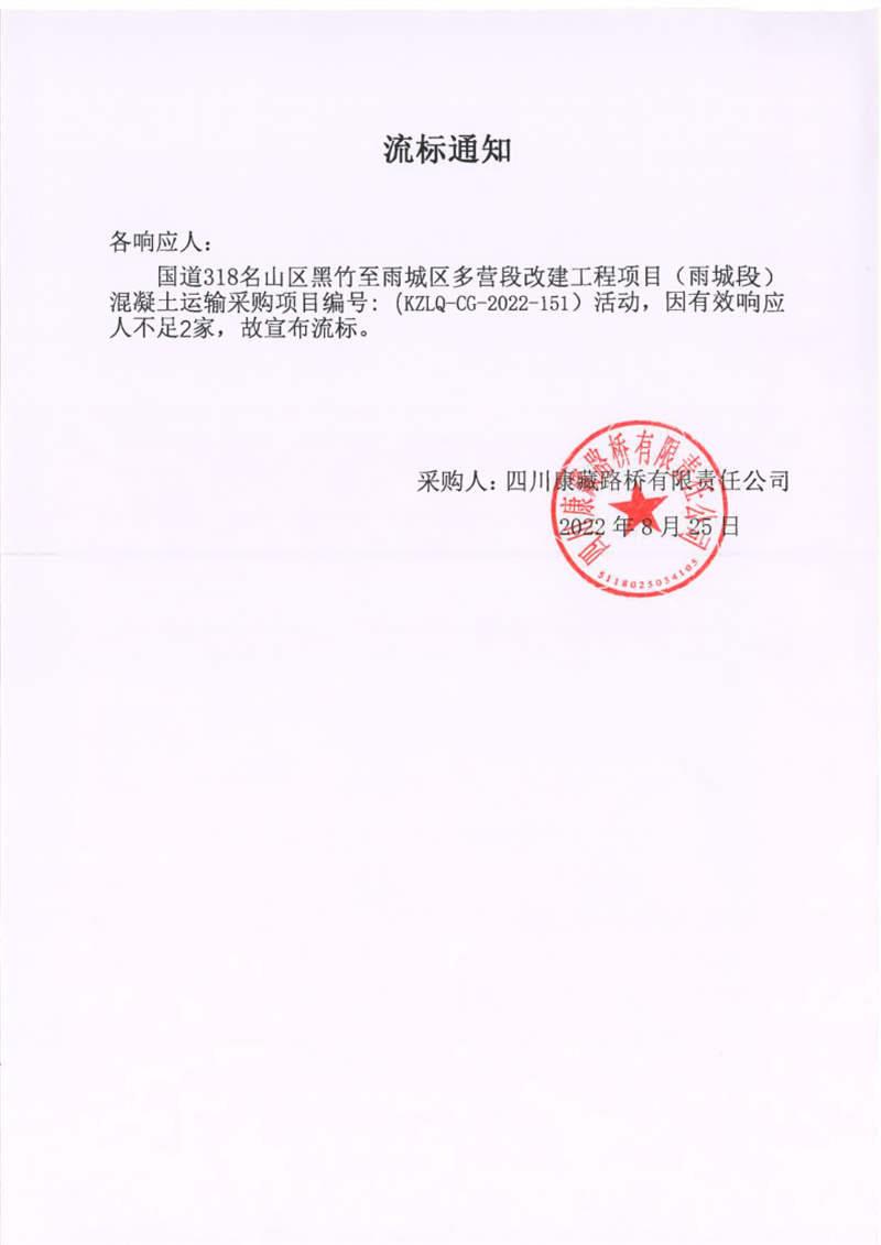 四川康藏路橋有限責(zé)任公司國道318名山區(qū)黑竹至雨城區(qū)多營段改建工程項(xiàng)目(雨城段)混凝土運(yùn)輸采購項(xiàng)目流標(biāo)通知