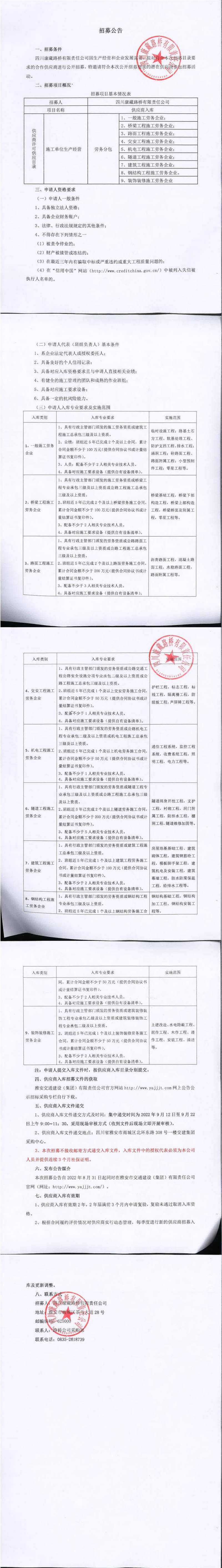 四川康藏路橋有限責(zé)任公司2022年第三季度供應(yīng)商入庫(kù)招募公告