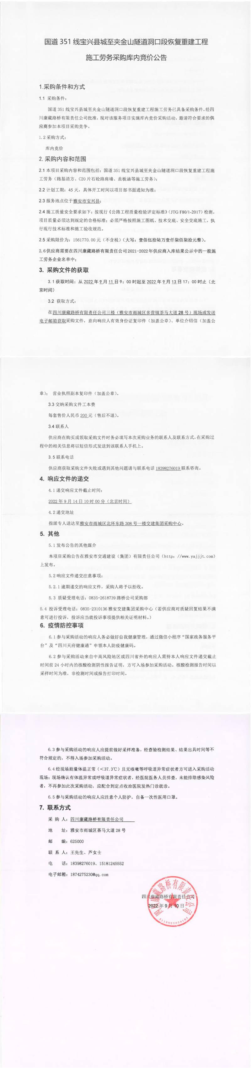 四川康藏路橋有限責(zé)任公司國道351線寶興縣城至夾金山隧道洞口段恢復(fù)重建工程施工勞務(wù)采購庫內(nèi)競價(jià)公告
