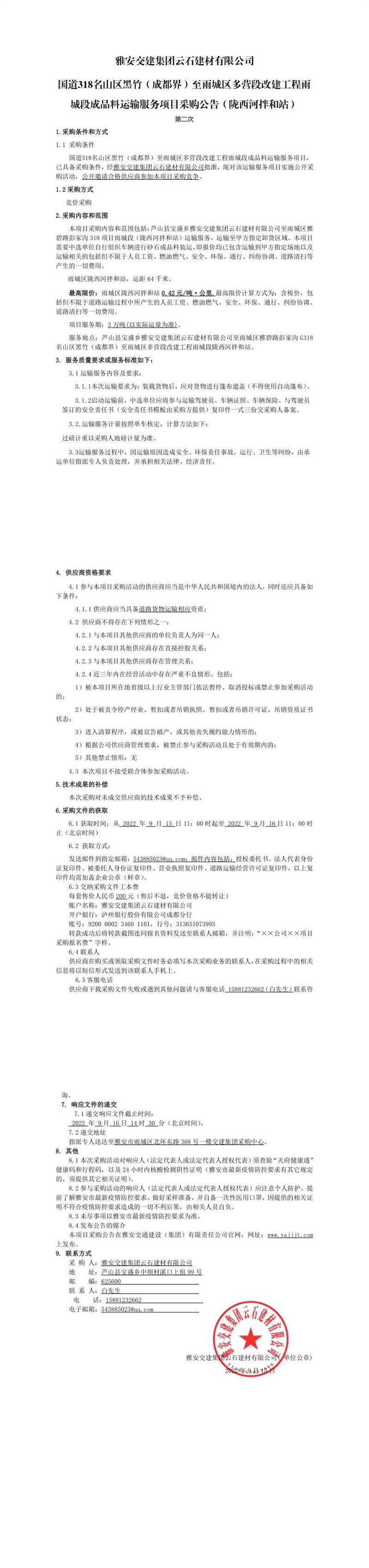 雅安交建集團云石建材有限公司國道318名山區(qū)黑竹(成都界)至雨城區(qū)多營段改建工程名山段成品料運輸服務(wù)項目采購公告(皇茶大道拌和站)