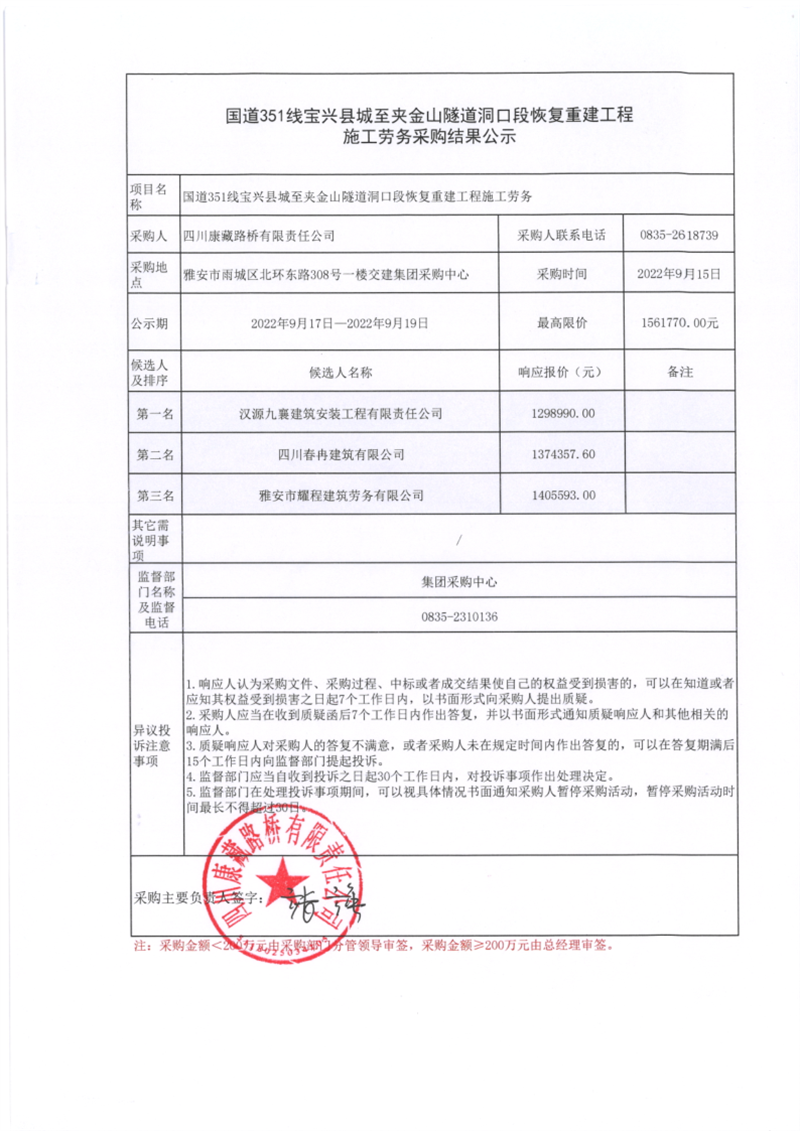 四川康藏路橋有限責任公司國道351線寶興縣城至夾金山隧道洞口段恢復重建工程施工勞務(wù)采購結(jié)果公示