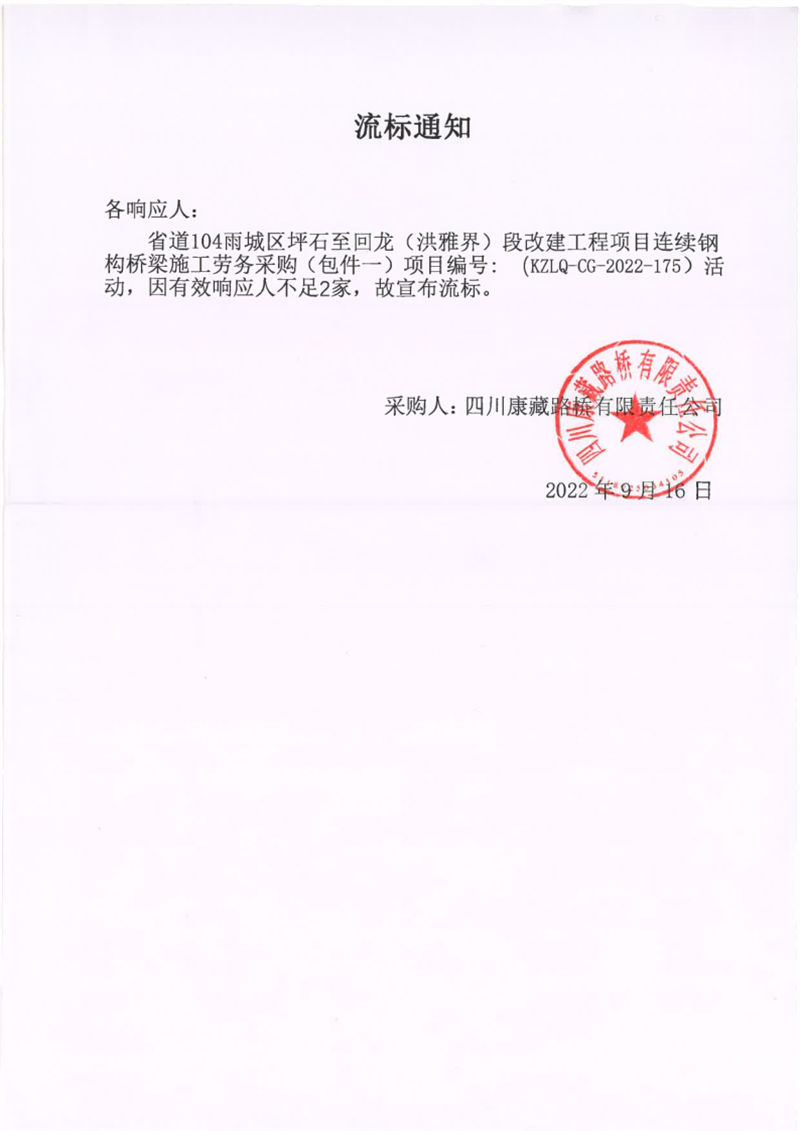 四川康藏路橋有限責(zé)任公司省道104雨城區(qū)坪石至回龍(洪雅界)段改建工程項(xiàng)目連續(xù)鋼構(gòu)橋梁施工勞務(wù)采購(包件一)流標(biāo)通知