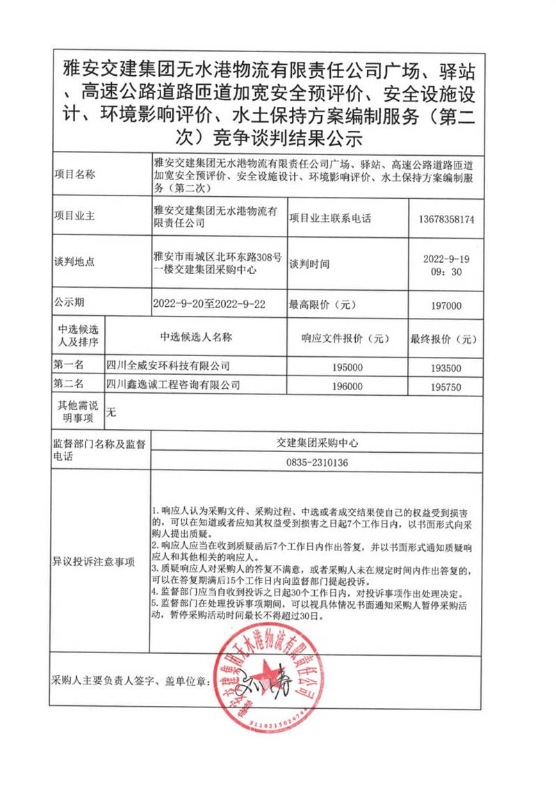雅安交建集團(tuán)無(wú)水港物流有限責(zé)任公司廣場(chǎng)、驛站、高速公路道路匝道加寬安全預(yù)評(píng)價(jià)、安全設(shè)施設(shè)計(jì)、環(huán)境影響評(píng)價(jià)、水土保持方案編制服務(wù)(第二次)競(jìng)爭(zhēng)談判結(jié)果公示