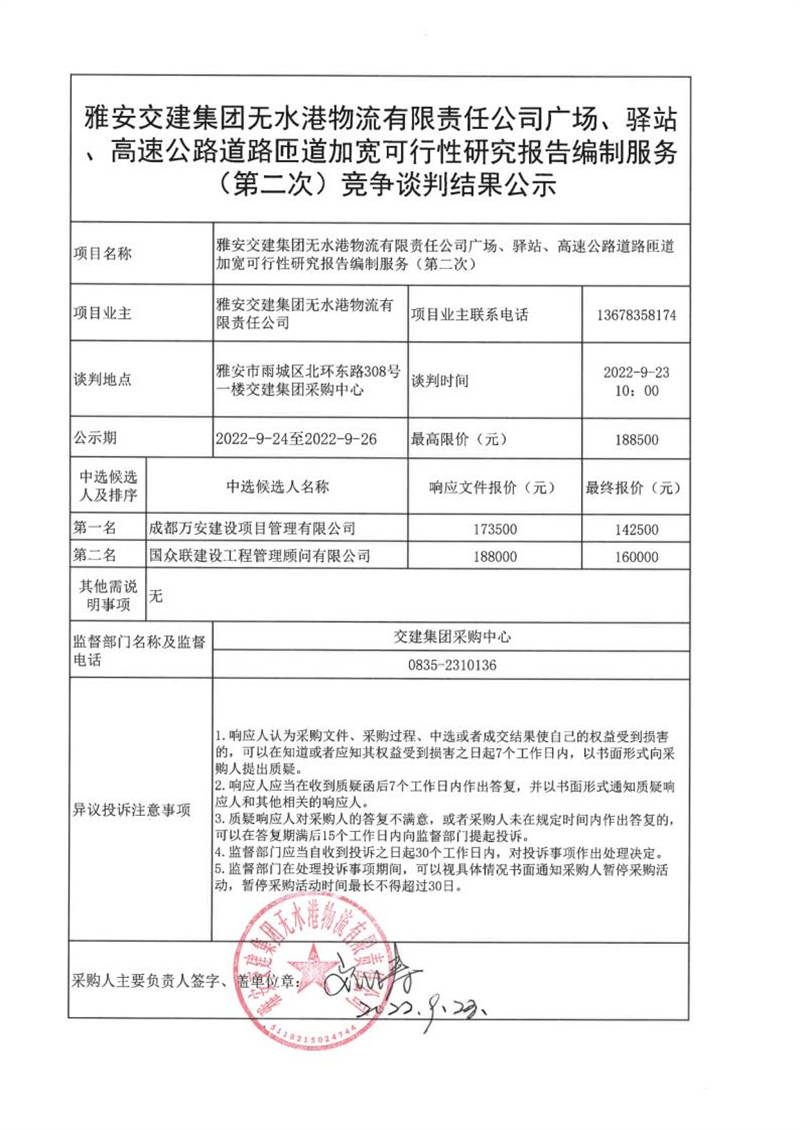 雅安交建集團(tuán)無水港物流有限責(zé)任公司廣場(chǎng)、驛站、高速公路道路匝道加寬可行性研究報(bào)告編制服務(wù)(第二次)競(jìng)爭(zhēng)談判結(jié)果公示