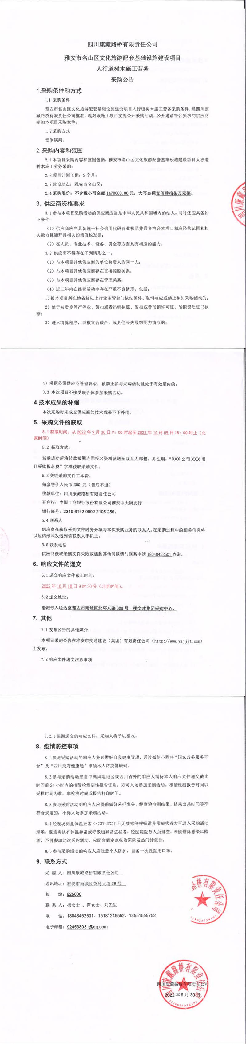 四川康藏路橋有限責(zé)任公司雅安市名山區(qū)文化旅游配套基礎(chǔ)設(shè)施建設(shè)項(xiàng)目人行道樹木施工勞務(wù)采購公告
