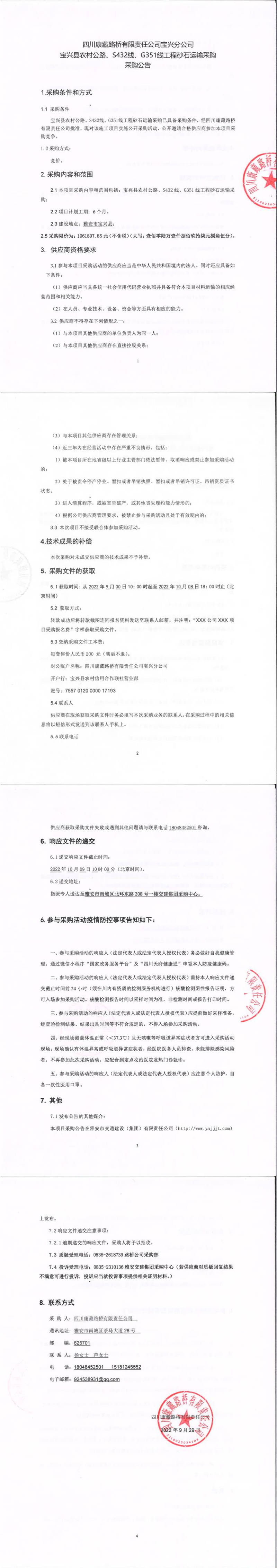 四川康藏路橋有限責(zé)任公司寶興分公司寶興縣農(nóng)村公路、S432線、G351線工程砂石運輸采購采購公告