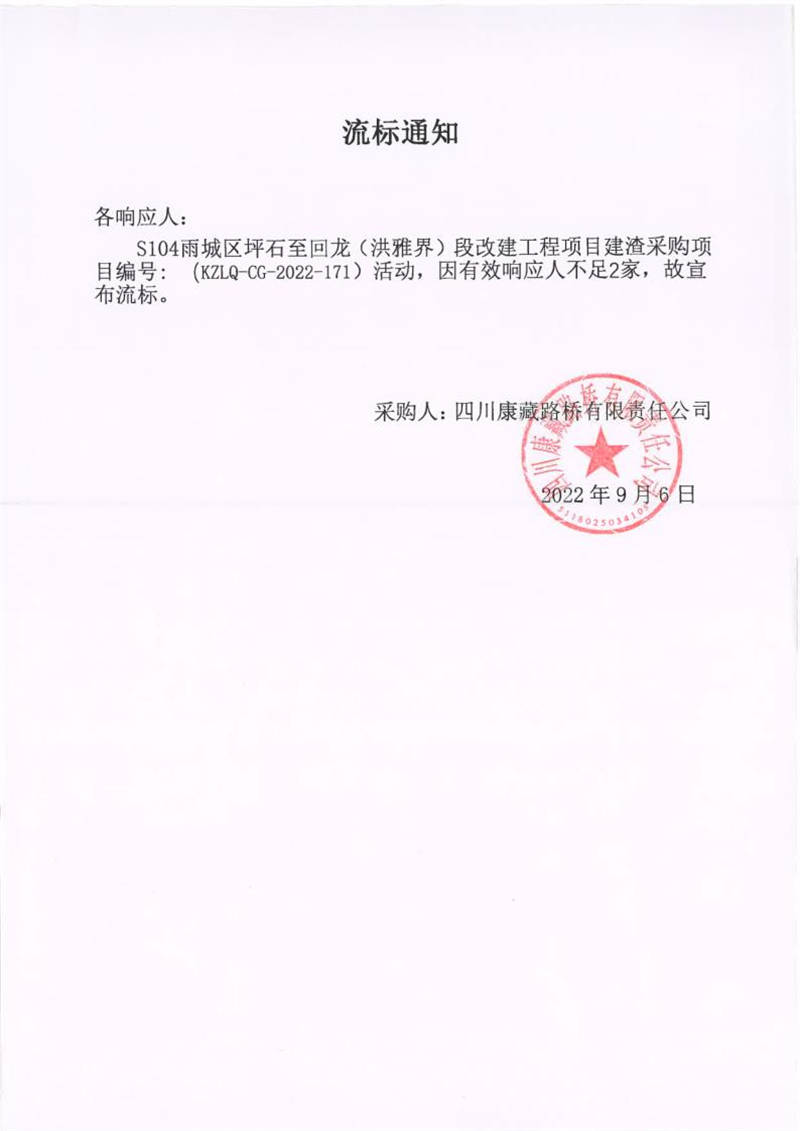 四川康藏路橋有限責(zé)任公司S104雨城區(qū)坪石至回龍(洪雅界)段改建工程項目建渣采購項目流標通知
