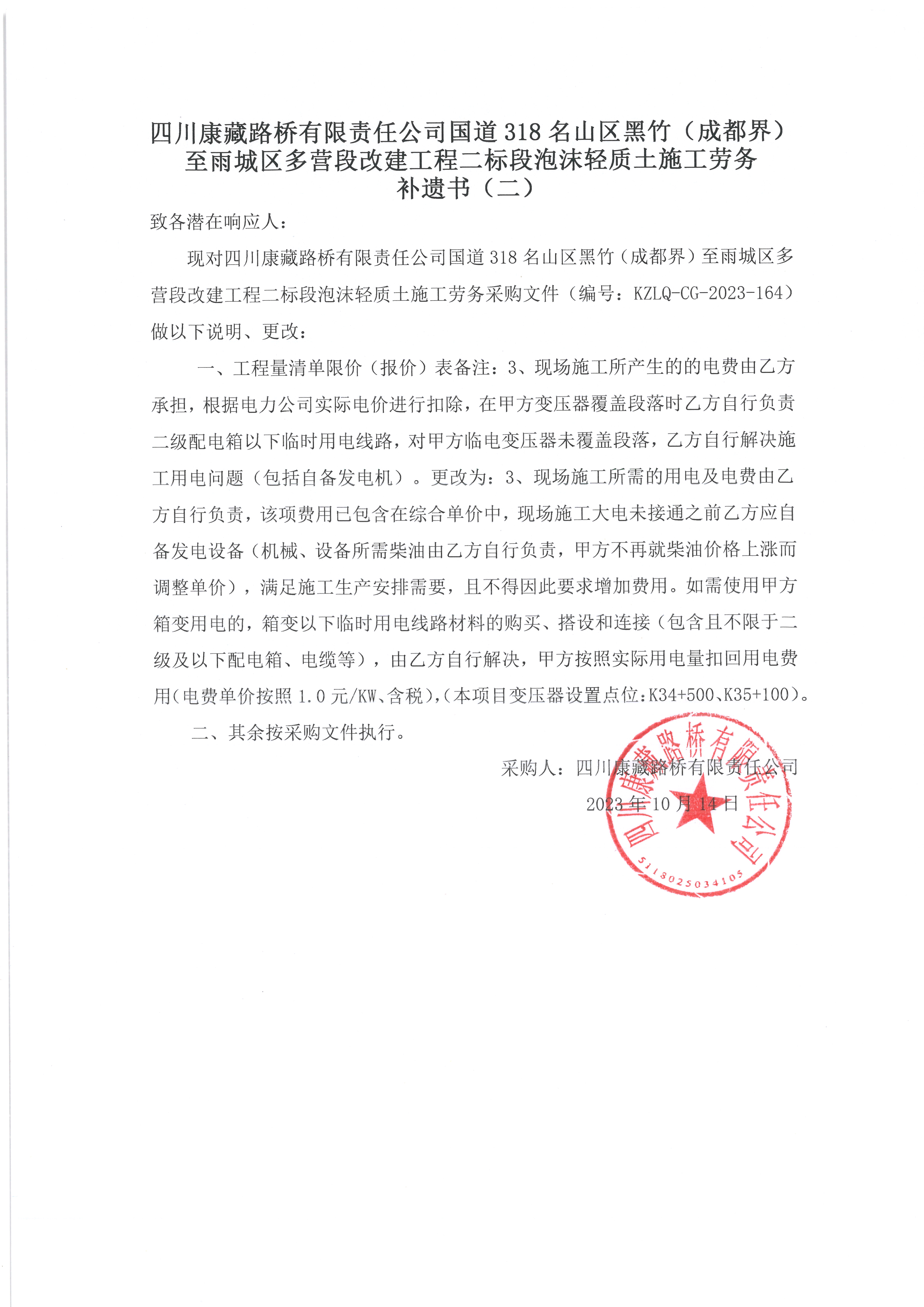 四川康藏路橋有限責任公司國道318名山區(qū)黑竹(成都界)至雨城區(qū)多營段改建工程二標段泡沫輕質土施工勞務 補遺書(二)