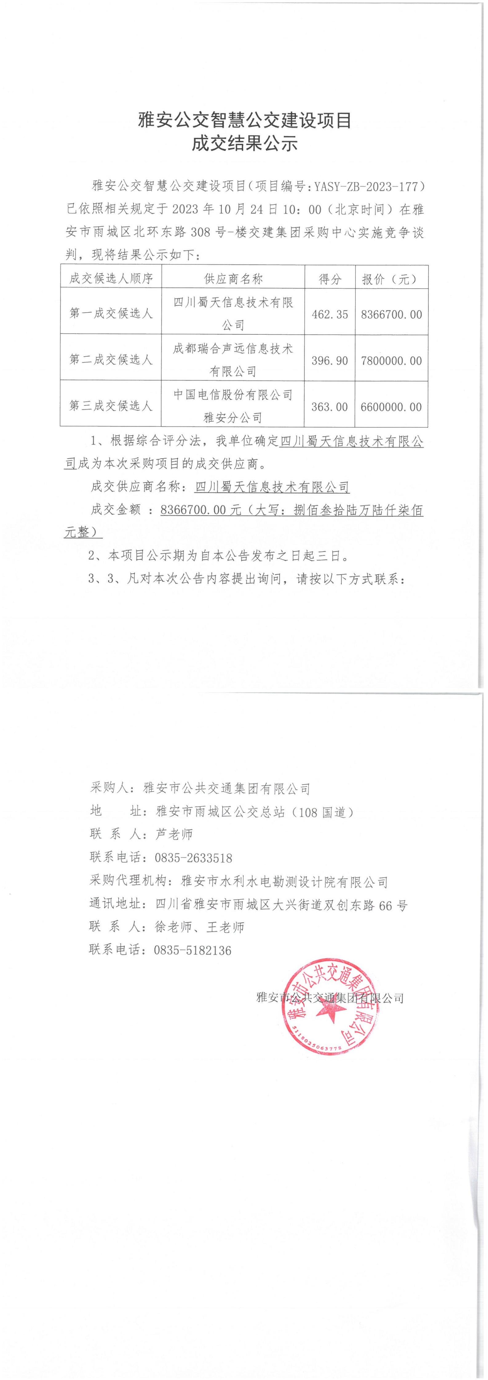 雅安市公共交通集團有限公司雅安公交智慧公交建設項目成交結果公示