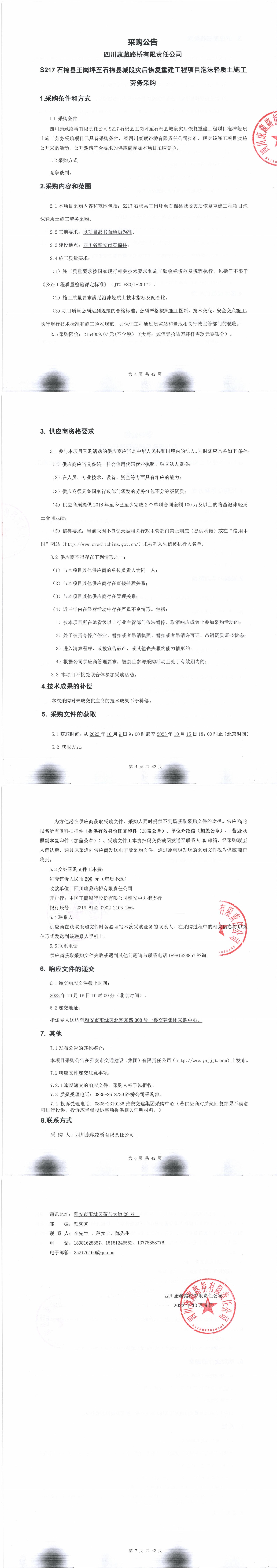 四川康藏路橋有限責(zé)任公司S217石棉縣王崗坪至石棉縣城段災(zāi)后恢復(fù)重建工程項(xiàng)目泡沫輕質(zhì)土施工勞務(wù)采購(gòu)公告