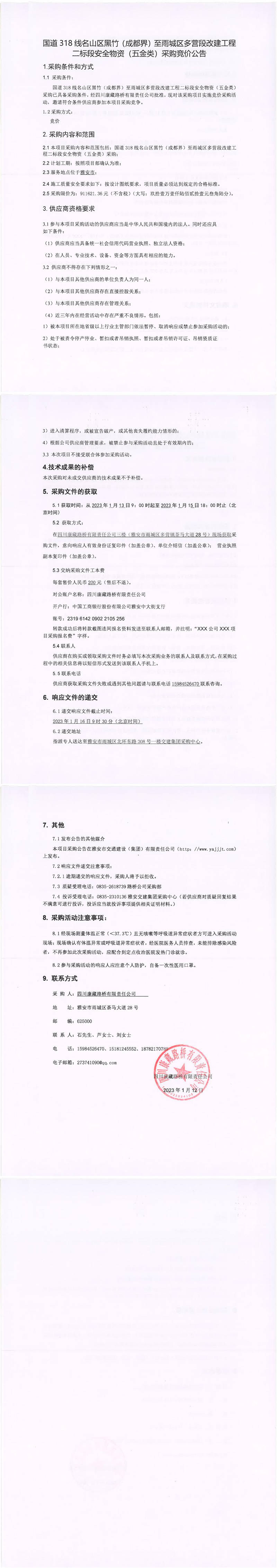四川康藏路橋有限責(zé)任公司國道318線名山區(qū)黑竹(成都界)至雨城區(qū)多營段改建工程二標段安全物資(五金類)采購競價公告