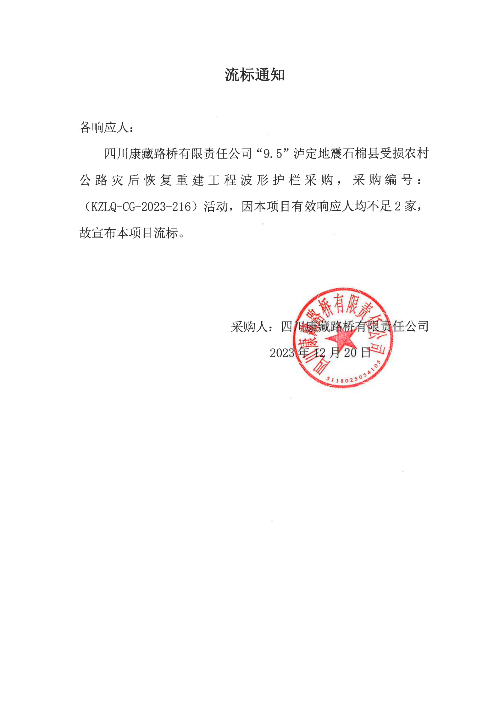 四川康藏路橋有限責任公司“9.5”瀘定地震石棉縣受損農(nóng)村公路災(zāi)后恢復(fù)重建工程波形護欄采購流標通知
