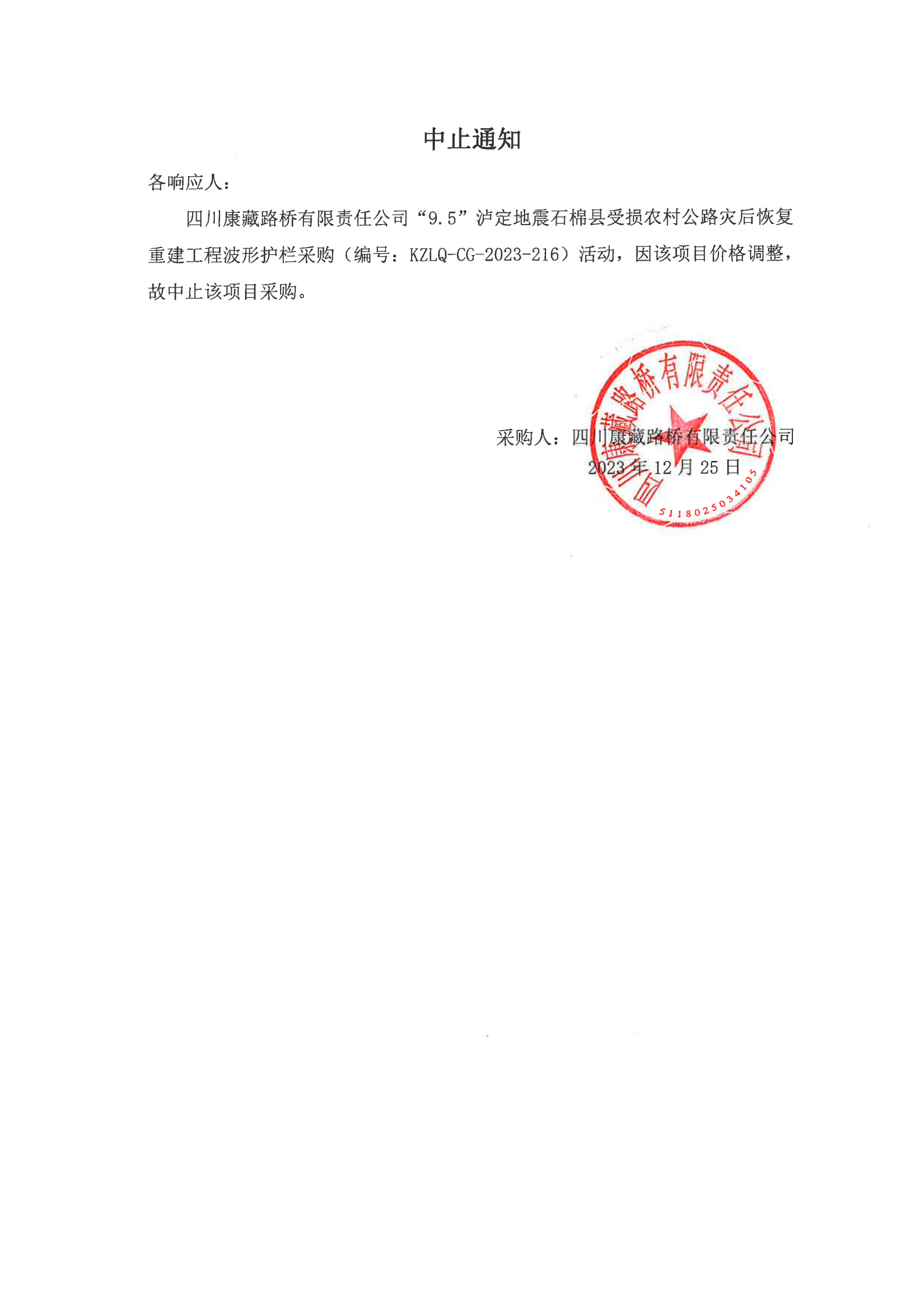 四川康藏路橋有限責任公司“9.5”瀘定地震石棉縣受損農(nóng)村公路災(zāi)后恢復(fù)重建工程波形護欄采購中止通知