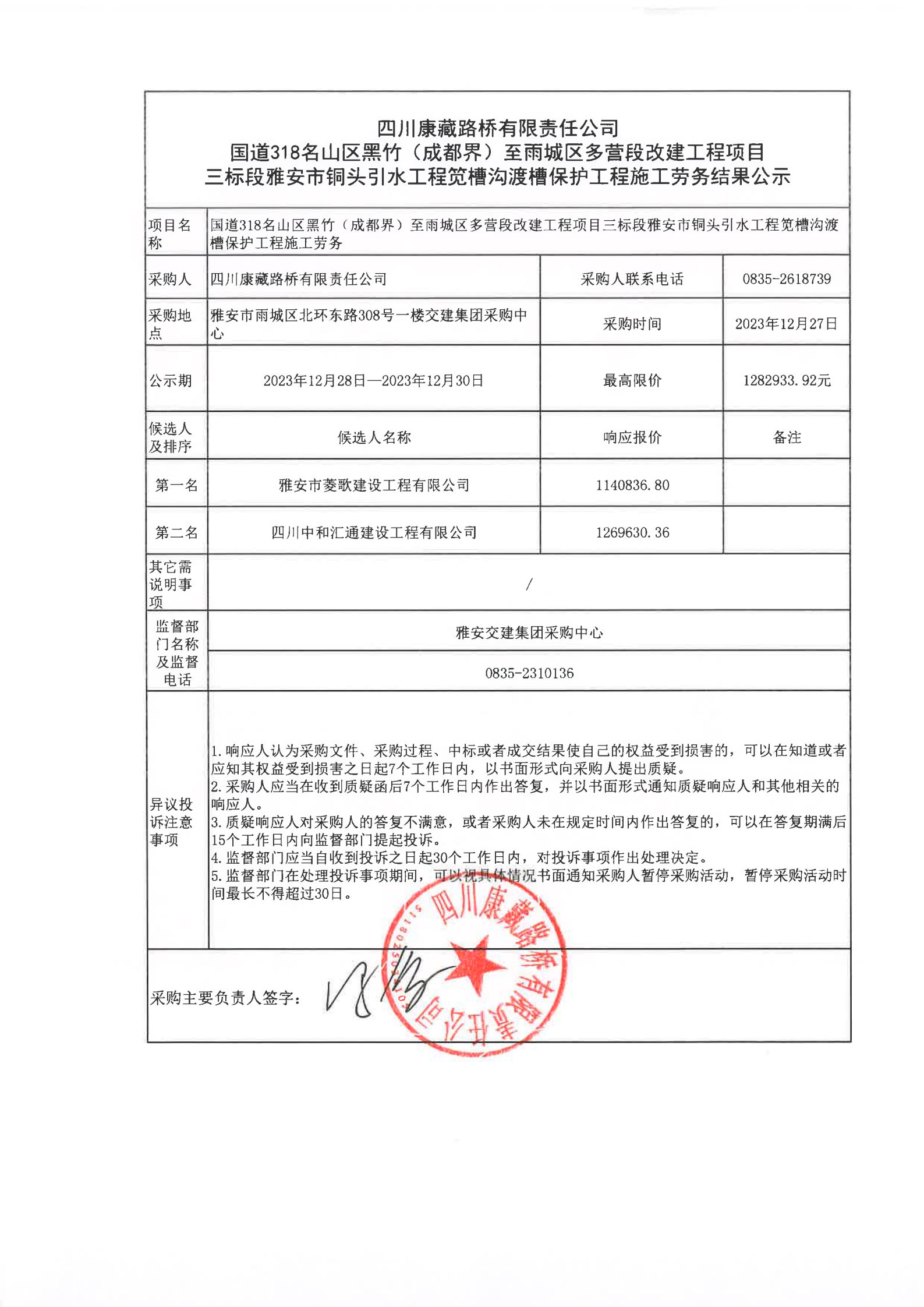 四川康藏路橋有限責(zé)任公司國(guó)道318名山區(qū)黑竹(成都界)至雨城區(qū)多營(yíng)段改建工程項(xiàng)目三標(biāo)段雅安市銅頭引水工程筧槽溝渡槽保護(hù)工程施工勞務(wù)結(jié)果公示