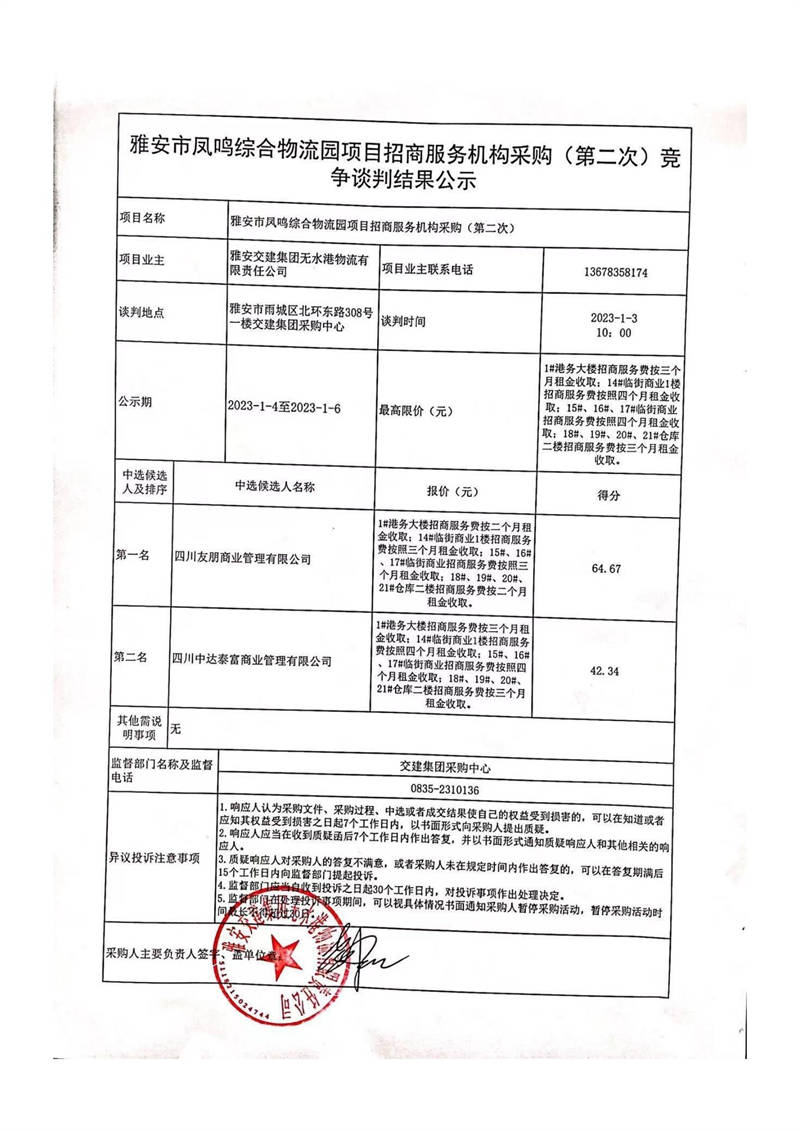 雅安交建集團(tuán)無水港物流有限責(zé)任公司雅安市鳳鳴綜合物流園項(xiàng)目招商服務(wù)機(jī)構(gòu)采購(第二次)競爭談判結(jié)果公示
